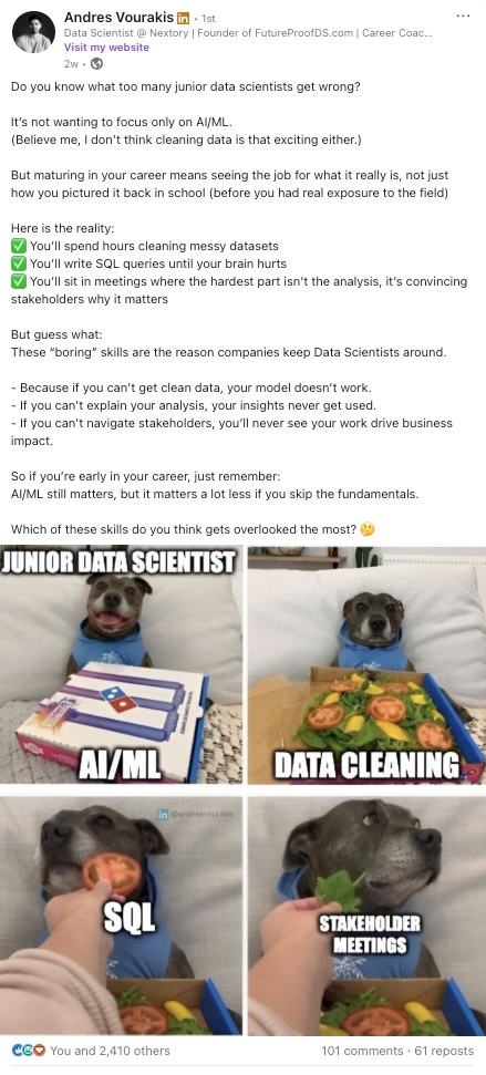 These “boring” skills are the reason companies keep Data Scientists around.The quotes around “boring” signal “I know you think this, but...” Then BAM, direct hit to their survival instinct. Not some abstract career advice. This is about keeping your job when layoffs come. Fear sells better than inspiration.