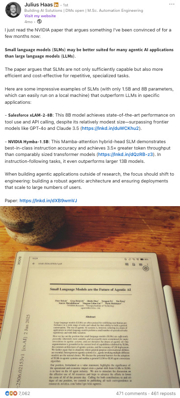 Notice how this post doesn’t say “Here’s an interesting paper.” It says “SLMs may be better suited for many agentic AI applications than LLMs.” That’s a position. That’s a flag planted.